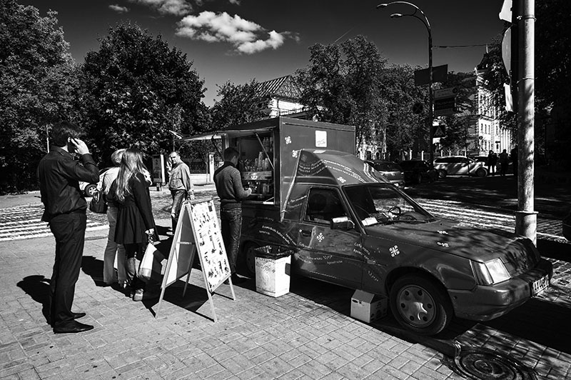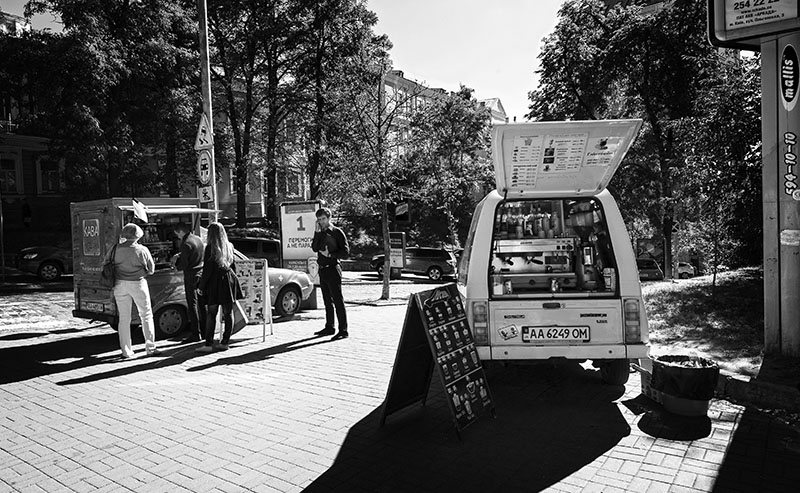 Mobiler Kaffeeverkäufer auf der Olhynska Straße oberhalb des Majdan. Kiew, September 2015