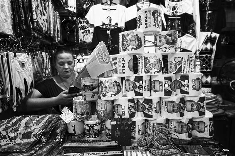 Klopapier mit Konterfei von Vladimir Putin an einem Verkaufsstand in der Unterführung des Majdan. Kiew, September 2015